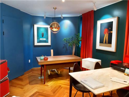 ▲ 3층 호리아트스페이스의 미팅 공간. 파란 벽지와 안창홍 작가의 디지털펜화가 잘 어울린다. [호리아트스페이스 제공]