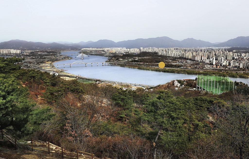 | ▲ 아차산에서 바라본 암사동 유적과 한강. 올림픽대로가 그 사이를 지나고 있다. 동그란 점 부분이 유적이다. [사진/조보희 기자] |
