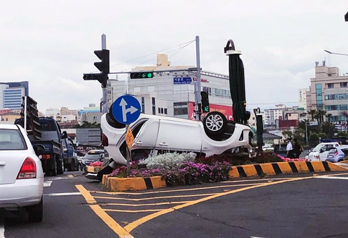 | ▲ 제주서 렌터카 전복…관광객 2명 부상 (서울=연합뉴스) 25일 낮 12시 52분께 제주시 용담1동 서문사거리에서 모닝 렌터카 차량이 연석에 부딪혀 전복되는 사고가 발생했다.