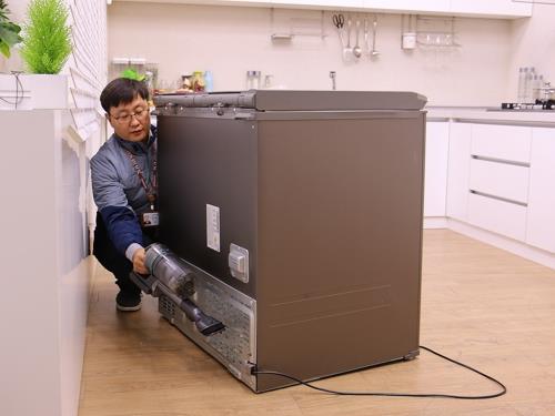 | ▲ 김치냉장고 기계실 먼지를 제거하는 삼성전자서비스 관계자 [삼성전자서비스 제공. 재판매 및 DB 금지] |