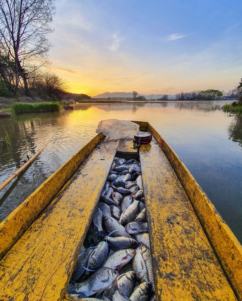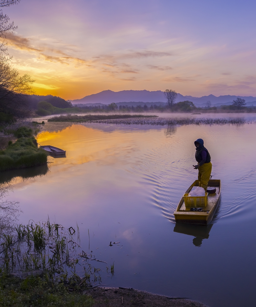 때마침 만선을 한 어부가 해가 떠오르는 우포늪을 배경으로 노를 저어 들어왔다. 배는 수심이 낮은 늪지대를 쉽게 오갈 수 있도록 바닥이 납작했다.