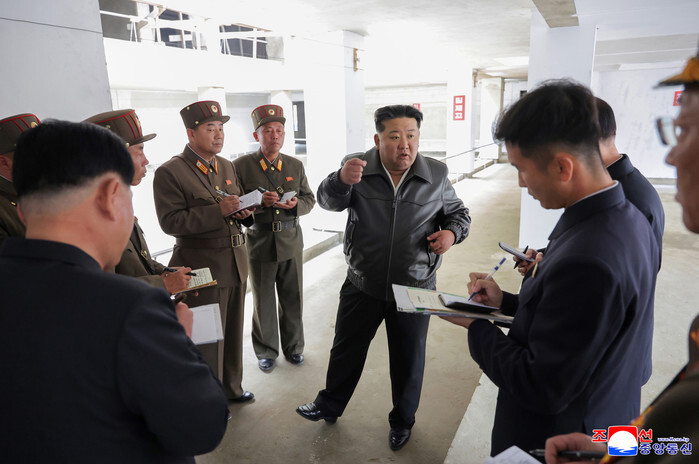 North Korean leader Kim Jong-un (C) inspects the construction site of school supply and teaching tool factories in Pyongyang on Nov. 4, 2025, in this photo released by the North's official Korean Central News Agency the following day. (For Use Only in the Republic of Korea. No Redistribution) (Yonhap)