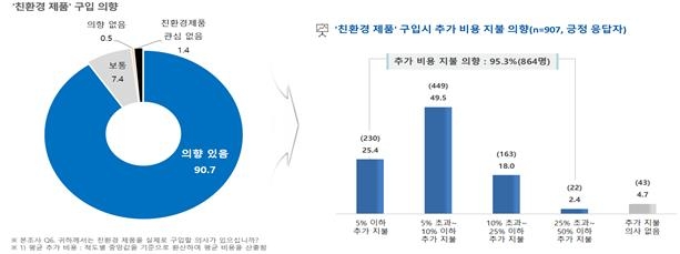 특히 전체 응답자의 86.4%, 친환경 제품 구매 의향이 있다고 답한 사람의 95.3%는 '일반 제품에 비해 가격이 다소 비싸더라도 친환경 제품을 구입하겠다'고 밝혔다. 추가 지급이 가능한 금액대는 5∼10% 사이가 가장 많았다.