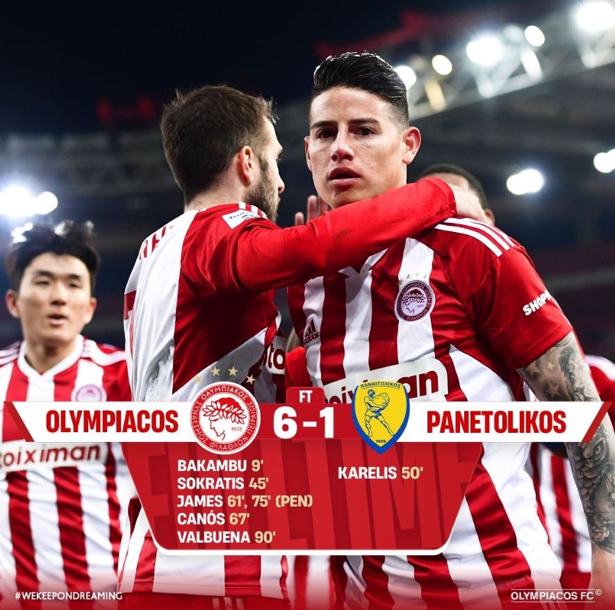 올림피아코스는 14일(한국시간) 그리스 피레아스의 카라이스카키스 스타디움에서 열린 파네톨리코스와 2022-2023 그리스 수페르리가 엘라다 22라운드 홈 경기에서 6-1로 크게 이겼다.