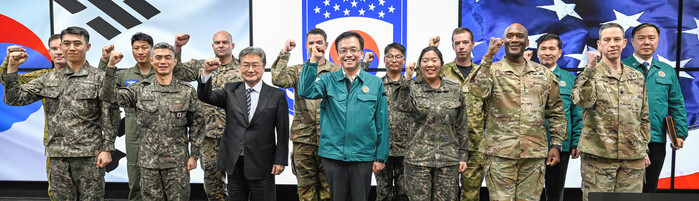 Acting President Choi Sang-mok (C, front) poses for a group photo with U.S. Gen. Xavier Brunson (2nd from R, front), chief of the South Korea-U.S. Combined Forces Command, acting U.S. Ambassador to South Korea Joseph Yun (3rd from L, front) and South Korean and U.S. soldiers, as he visits CP Tango, or Command Post Theater Air Naval Ground Operations, in Seongnam, south of Seoul, on March 18, 2025, in this photo released by the finance ministry. The visit came after South Korea and the United States' joint annual military exercise Freedom Shield kicked off March 10 for an 11-day run. (PHOTO NOT FOR SALE) (Yonhap)