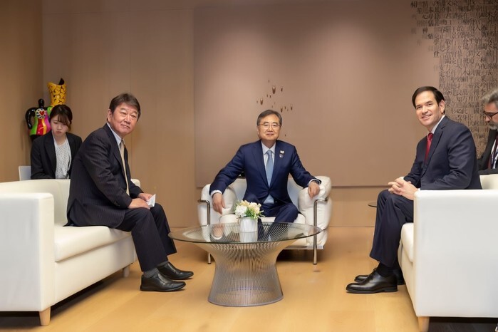 Japanese Foreign Minister Toshimitsu Motegi, South Korean Foreign Minister Cho Hyun and U.S. Secretary of State Marco Rubio (from L to R) hold a trilateral meeting in the southeastern city of Gyeongju on Oct. 29, 2025, on the sidelines of this year's summit of the Asia-Pacific Economic Cooperation forum, in this photo released by the South Korean foreign ministry. (PHOTO NOT FOR SALE) (Yonhap)