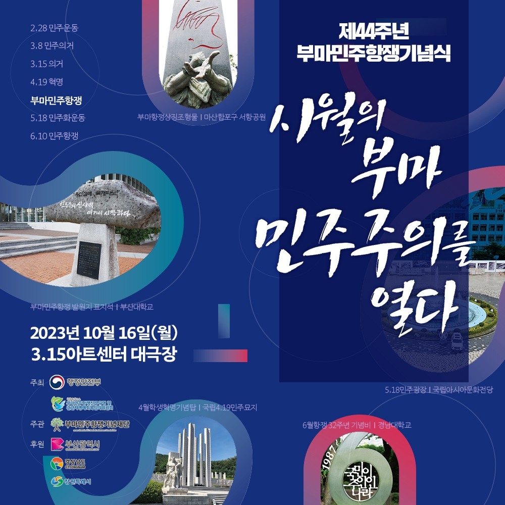 행정안전부와 부마민주항쟁진상규명 및 관련자명예회복심의위원회가 주최하는 기념식은 16일 오전 10시 마산회원구 3·15아트센터에서 열린다.