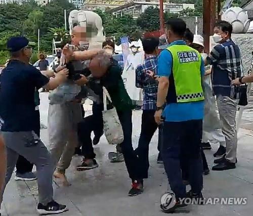 ▲ 조계종 노조원 폭행하는 스님 (서울=연합뉴스) 14일 서울 서초구 봉은사 앞에서 자승 전 총무원장을 비판하는 1인 시위를 준비하던 조계종 노조원에게 한 승려(왼쪽 두번째)가 폭력을 행사하고 있다. 2022.8.14 [조계종 노조 제공 영상 캡처. 재판매 및 DB 금지] photo@yna.co.kr (끝)