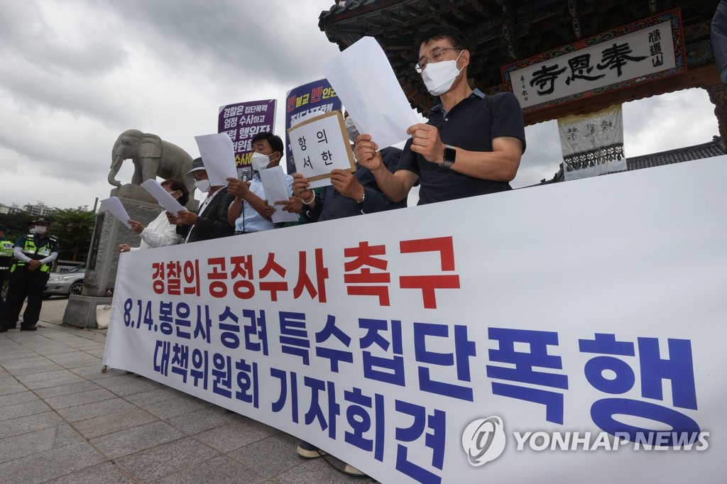 ▲ 봉은사 승려 특수집단폭행 대책위원회 출범 (서울=연합뉴스) 서대연 기자 = 8·14 봉은사 승려 특수집단폭행 대책위원회 회원들이 31일 서울 강남구 봉은사 앞에서 위원회 출범 기자회견을 열고 있다. 이들은 지난 14일 조계종에서 해고된 한 노조원이 봉은사 앞에서 자승 전 총무원장의 종단 내 선거 개입을 주장하는 1인 시위를 하려다 승려 여러 명에게 집단폭행을 당하는 사건이 벌어지자 이 사건이 사전 계획된 것이라 주장하며 경찰의 공정한 수사를 촉구했다. 2022.8.31 dwise@yna.co.kr
