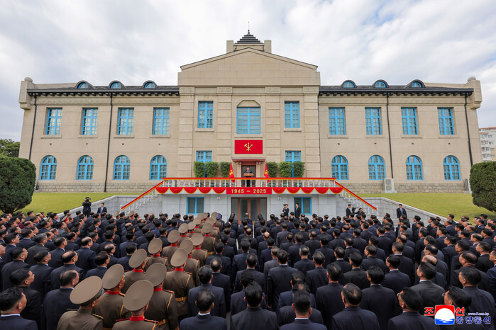 North Korean leader Kim Jong-un (rear) delivers a speech as he visits the Party Founding Museum in Pyongyang on Oct. 8, 2025, on the occasion of the 80th founding anniversary of the ruling Workers Party of Korea that falls on Oct. 10, in this photo released by the North's official Korean Central News Agency on Oct. 9. (For Use Only in the Republic of Korea. No Redistribution) (Yonhap)