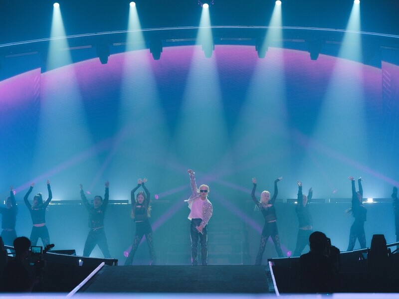 가수 태양이 'T'자형 무대 앞으로 뛰어나와 펄쩍펄쩍 뛰자 눈부신 붉은색과 푸른색 레이저 조명이 객석을 휘저었다.