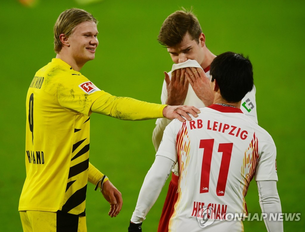 | ▲ 경기 후 옛 동료인 도르트문트 홀란과 인사하는 라이프치히 황희찬(11번) [EPA=연합뉴스] |