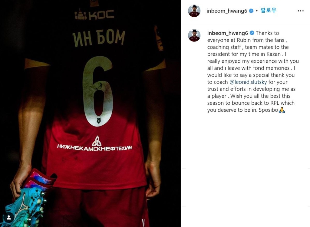 황인범은 28일 소셜 미디어에 "카잔에서 보낸 시간 동안 팬과 코치진, 동료들, 회장 등 모두에게 감사하다"고 영문 메시지를 올렸다.