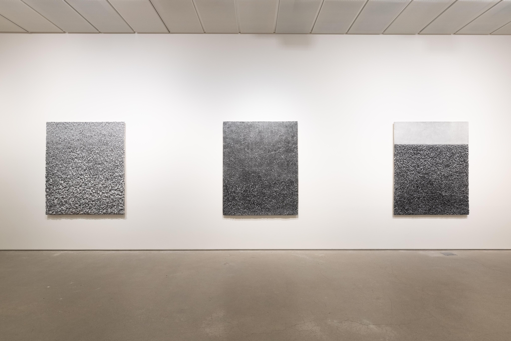 숯과 한지가 섞여 완성된 작품에는 신비롭고 장엄한 자연을 옮겨놓은 듯한 풍경이 펼쳐진다. 희뿌연 안개가 낀 듯한 여명부터 칠흑 같은 어둠까지 무채색이 퍼지는 화면에 여러 겹 쌓인 재료들이 묵직하고 입체적인 지층을 만들어낸다.