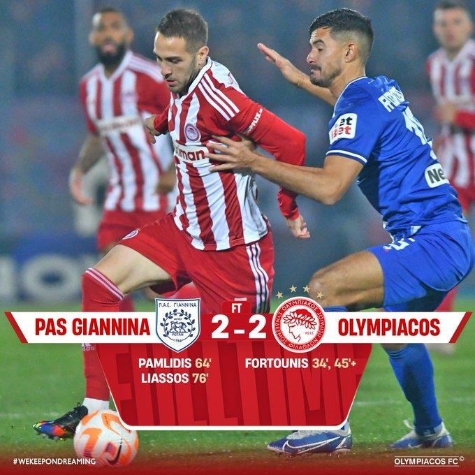 올림피아코스는 22일(한국시간) 그리스 이오안니아의 이오안니아국립경기장에서 열린 2022-2023 수페르리가 엘라다 14라운드 원정 경기에서 PAS 야니나와 난타전 끝에 2-2로 비겼다.