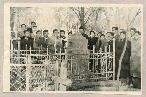 ▲ 1951년 홍범도 장군 묘지를 참배하는 '레닌기치사' 직원들 (서울=연합뉴스) 1951년 홍범도 장군 묘지를 참배하는 고려인 한글신문 '레닌기치사' 직원들. 2019.4.23 [광주고려인마을 인문사회연구소 제공] photo@yna.co.kr