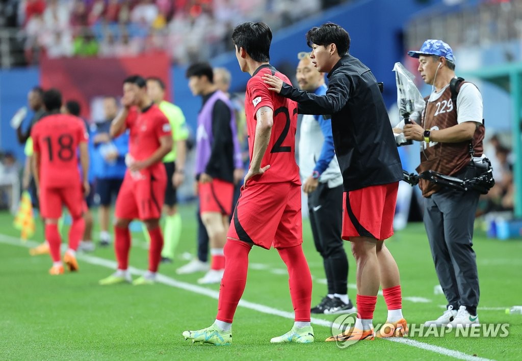 | ▲ 설영우에게 이야기하는 손흥민 (대전=연합뉴스) 류영석 기자 = 20일 대전월드컵경기장에서 열린 축구 국가대표팀 평가전 한국과 엘살바도르의 경기. 교체 멤버인 손흥민이 타임 아웃 중 설영우에게 이야기를 하고 있다. 2023.6.20 ondol@yna.co.kr |