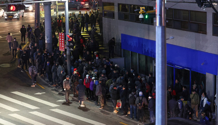 Daily wage workers gather on a sidewalk near a subway station in Seoul's Guro Ward on Feb. 18, 2025, waiting to be employed for the day. The number of employees in the construction sector decreased 168,000 from a year earlier to 1.92 million in January, its lowest level since 1.88 million in 2017. (Yonhap)