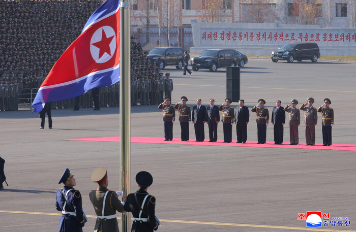 North Korean leader Kim Jong-un (C) watches a North Korean flag being hoisted as he visits the public security ministry in Pyongyang on Nov, 18, 2025, on the occasion of the 80th founding anniversary of the public security organ, in this photo released by the North's official Korean Central News Agency the next day. (For Use Only in the Republic of Korea. No Redistribution) (Yonhap)