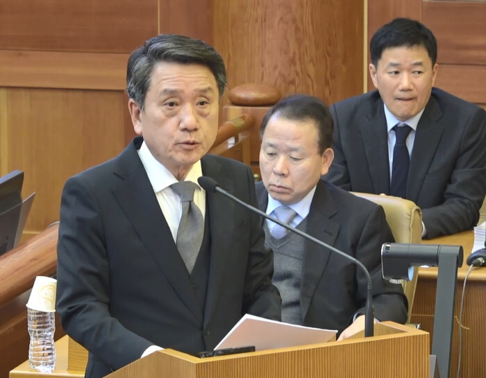 Lee Kwang-bum, a lawyer representing the National Assembly, speaks at the Constitutional Court in Seoul on Feb. 25, 2025, during the 11th and final hearing of President Yoon Suk Yeol's impeachment trial in connection to his short-lived imposition of martial law in December, in this photo provided by the court. (PHOTO NOT FOR SALE) (Yonhap)