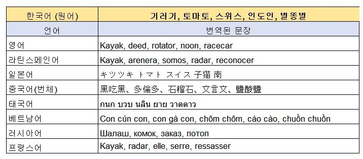영어로는 'Kayak'(카약), 'deed'(행위), 'rotator'(회전), 'noon'(정오), 'racecar'(레이싱카)로 번역됐다.
