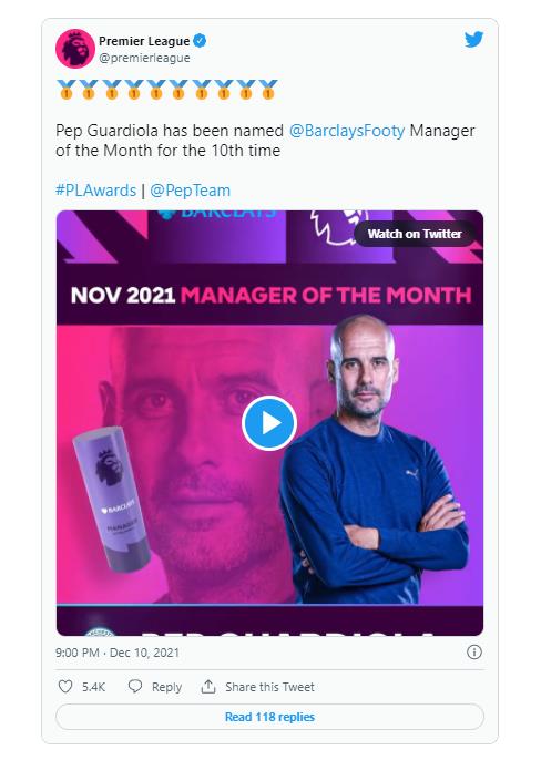 프리미어리그 사무국은 10일(한국시간) "과르디올라 감독을 2021-2022시즌 EPL 11월의 감독으로 선정했다"고 발표했다.