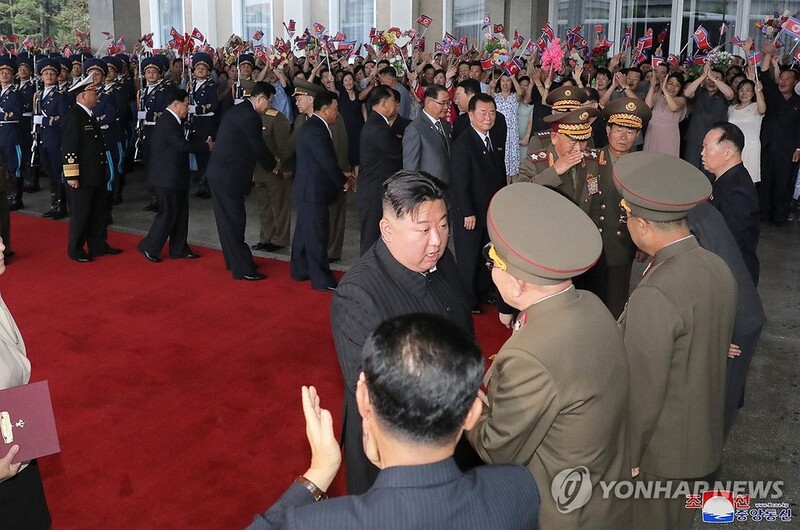 ▲ This photo, carried by North Korea's official Korean Central News Agency on Sept. 12, 2023, shows the North's leader Kim Jong-un saluted by soldiers ahead of a trip to Russia. (For Use Only in the Republic of Korea. No Redistribution) (Yonhap)