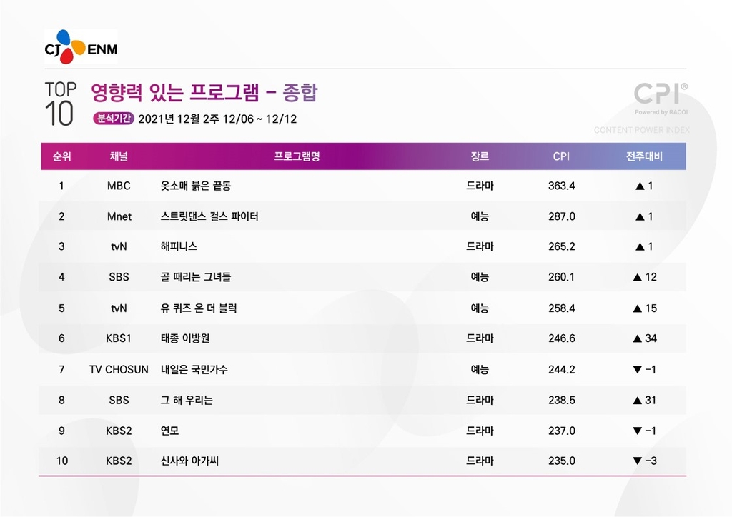 한편, 12월 둘째 주 CPI 1위는 매회 최고시청률을 경신 중인 MBC TV 금토드라마 '옷소매 붉은 끝동'이 차지했다.