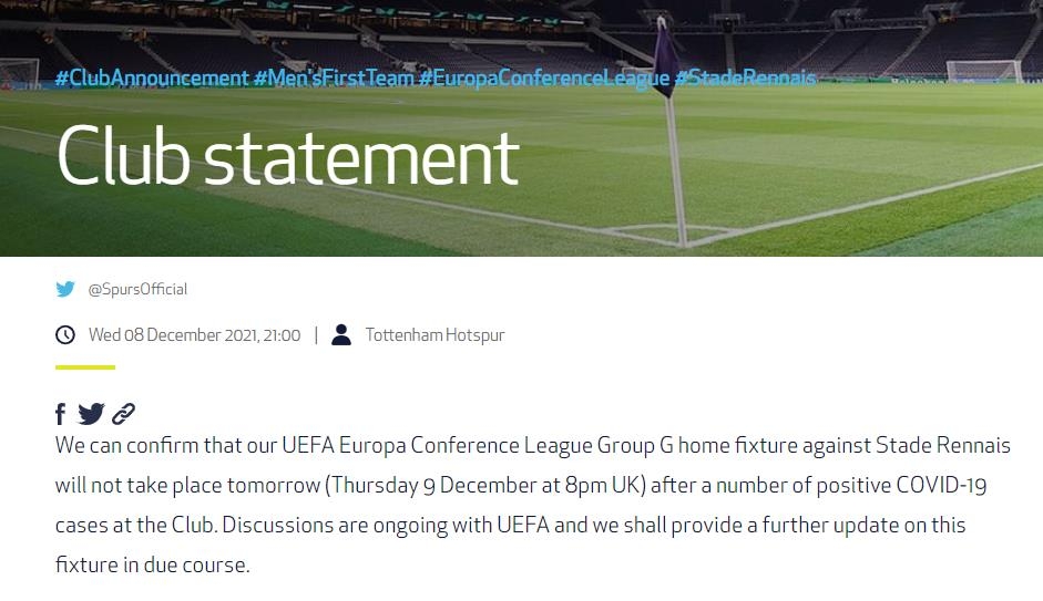 토트넘은 9일(한국시간) "클럽 내 다수 코로나19 양성 사례가 나옴에 따라 내일 예정된 스타드 렌(프랑스)과의 콘퍼런스리그 홈 경기는 열리지 않는다"며 "UEFA와 논의를 진행 중이다. 후속 사항은 추후 발표할 것"이라고 발표했다.