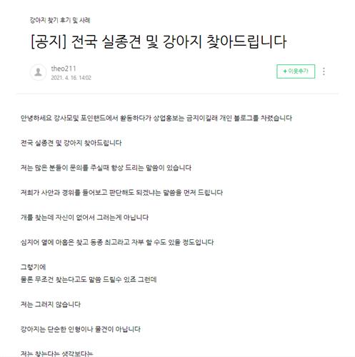 | ▲ 자칭 '강아지 탐정'의 블로그 글 [네이버 블로그 캡처. 재판매 및 DB 금지] |