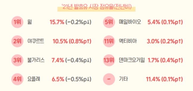 | ▲ 2021년 발효유 시장 브랜드 점유율 [한국농수산식품유통공사 식품산업통계정보 누리집 갈무리] |