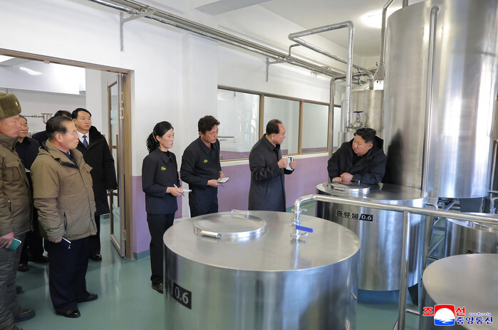 North Korean leader Kim Jong-un (R) inspects a regional factory in South Phyongan Province, western North Korea, on Dec. 3, 2025, ahead of its official opening, in this photo carried by the North's official Korean Central News Agency on Dec. 5. Kim visited regional industrial factories in several counties in the province, including Sinyang, Pukchang and Unsan, according to the KCNA. The construction of the factories is part of Kim's signature regional development policy to build modern factories in 20 cities and counties each year over a 10-year period to improve the living conditions of people in regional areas. (For Use Only in the Republic of Korea. No Redistribution) (Yonhap)