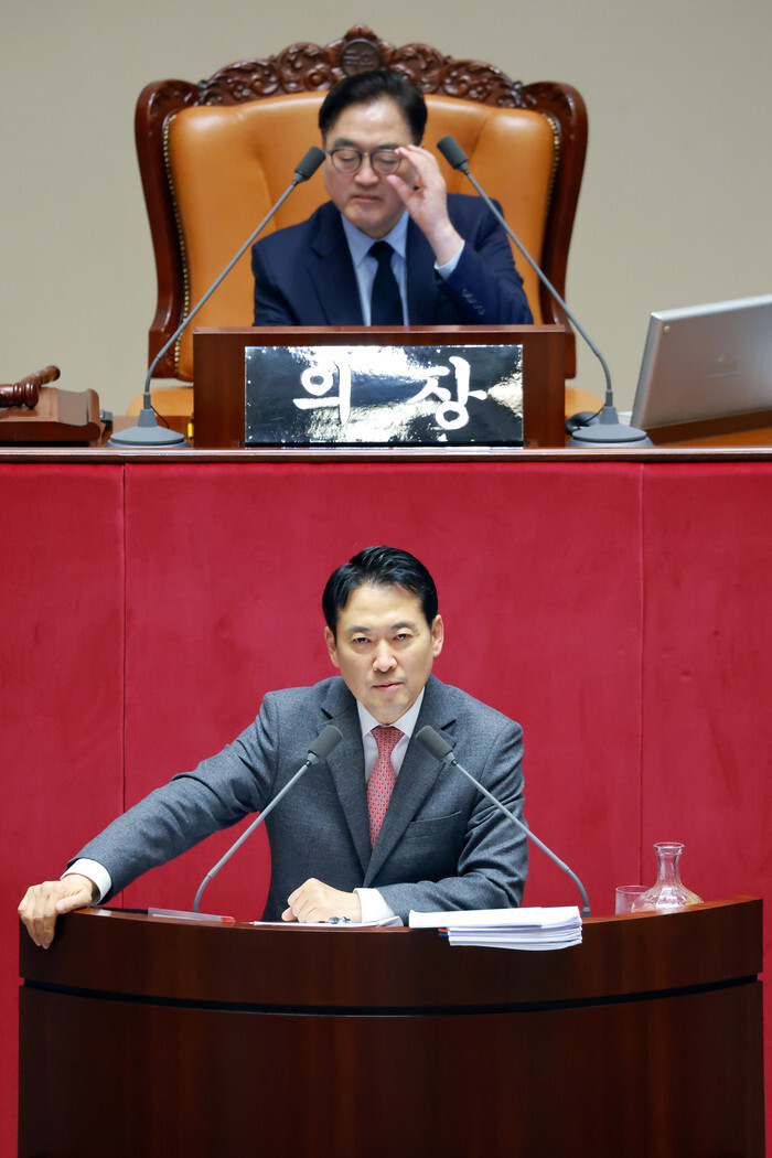Jang Dong-hyeok (below), leader of the main opposition People Power Party, continues to filibuster to block a bill, led by the ruling Democratic Party, to establish a special tribunal for insurrection cases linked to former President Yoon Suk Yeol's failed imposition of martial law during a plenary session of the National Assembly in Seoul on Dec. 23, 2025. (Yonhap)