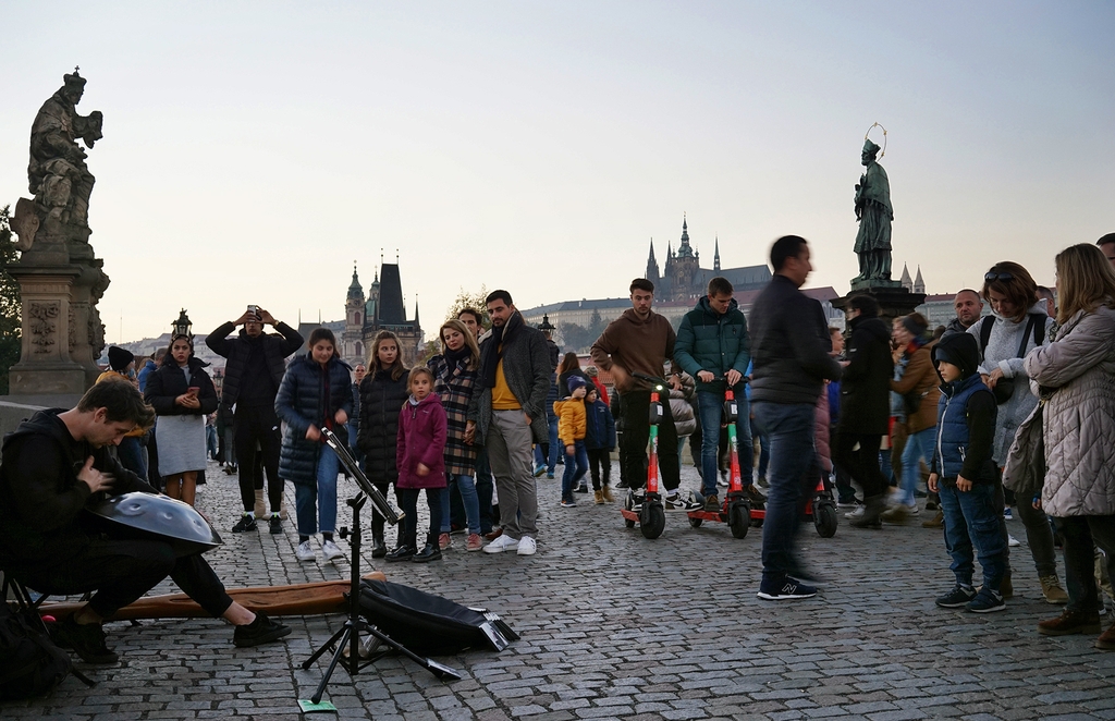 ▲ 카를교에서 흥겨운 버스킹을 즐기는 여행자들 [사진/진성철 기자]