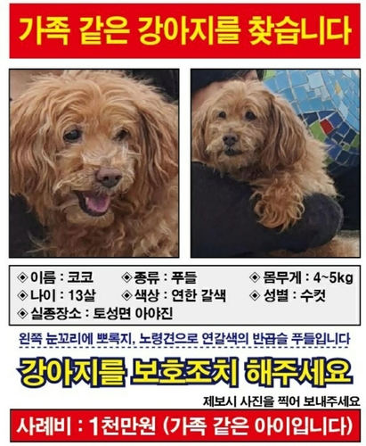 | ▲ 실종 반려견 코코 제보자 A씨 제공. A씨는 코코를 찾아주는 사람에게 1천만원을 주겠다고 밝혔다. 재판매 및 DB 금지. |