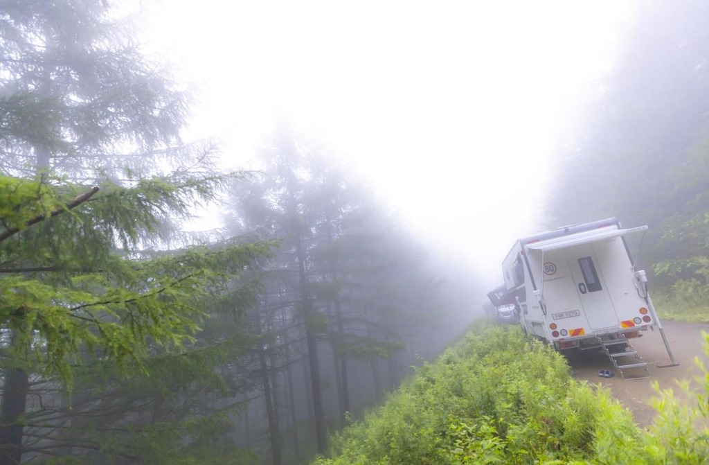 이곳에 캠핑카와 카라반들이 있는 이유는, 바로 옆이 수십m 높이의 잣나무들이 자리 잡고 있기 때문이었다.