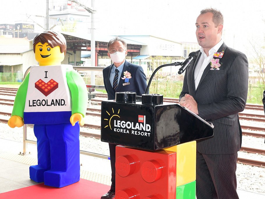 | ▲ 지난 4월 22일 테마열차 환영사 하는 레고랜드 코리아 리조트 사장 [레고랜드 코리아 리조트 제공. 재판매 및 DB 금지] |