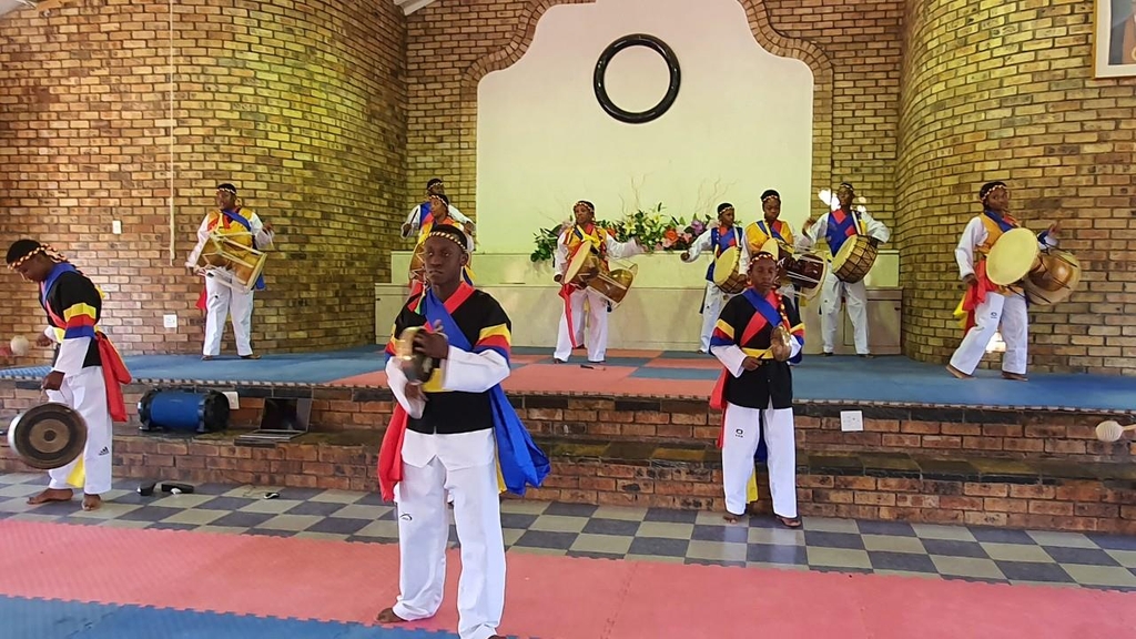 | ▲ 사물놀이 공연하는 남아공 라모코카 청소년들 (라모코카<남아공>=연합뉴스) 김성진 특파원 = 10일(현지시각) 남아프리카공화국 노스웨스트주 라모코카 마을의 '아프리카 어린이 돕는 모임' 다목적실에서 청소년들이 속에 태권도복을 입은 채 사물놀이 공연을 하고 있다. 2021.11.11 sungjin@yna.co.kr |