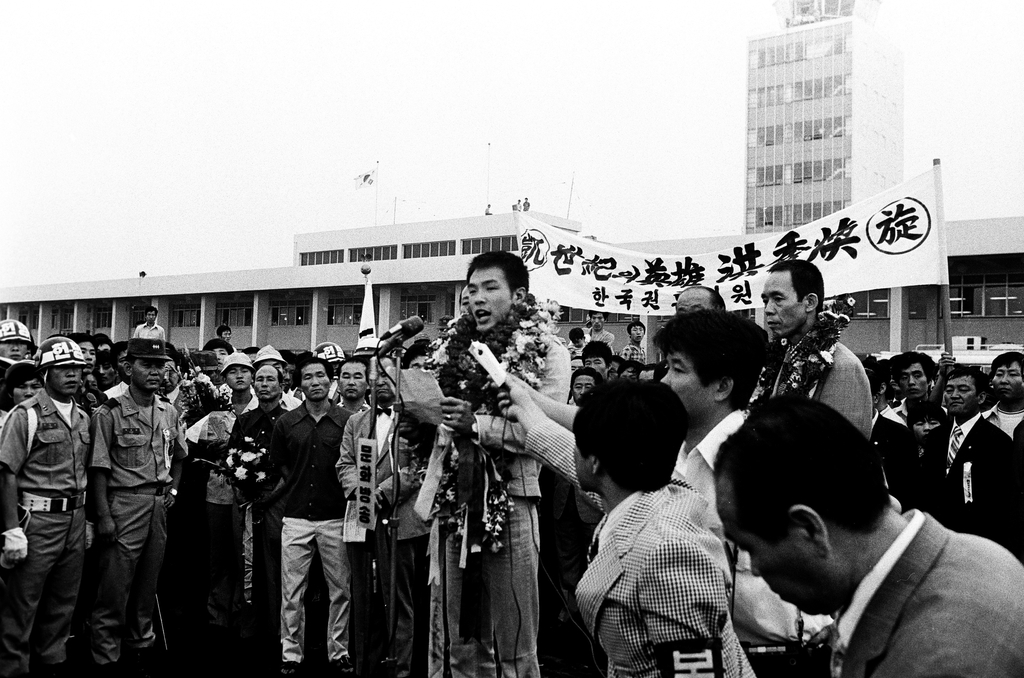 | ▲ 김포공항 청사 앞에서 당시 '복싱 영웅' 홍수환의 귀국 환영식이 열렸다. 홍수환은 남아공에서 열린 세계복싱협회(WBA) 밴텀급 세계 챔피언 타이틀전에서 승리하고 돌아오는 길이다. 1974년 [임정의 제공] |