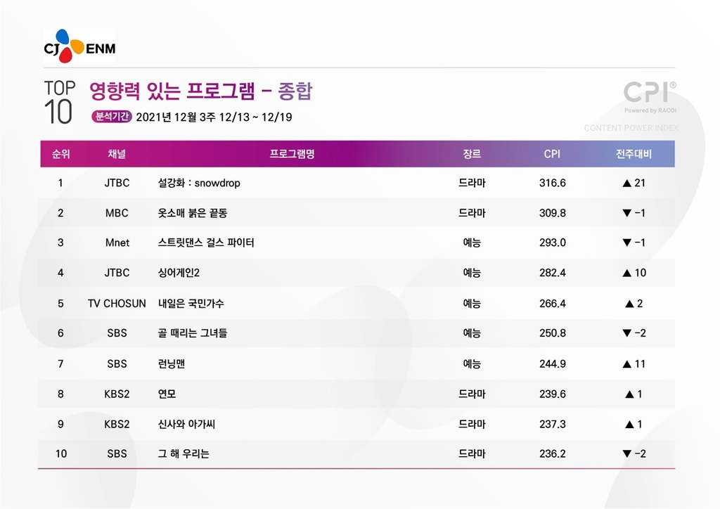 28일 CJ ENM이 발표한 12월 셋째 주(13∼19일) 콘텐츠영향력평가지수(CPI·하단용어설명 참고) 집계에서 JTBC 토일드라마 '설강화'와 SBS TV 스포츠 예능 '골 때리는 그녀들'(이하 '골때녀')이 종합 부문 1위와 6위에 올랐다. CPI 지수는 각각 316.6, 250.8을 기록했다.