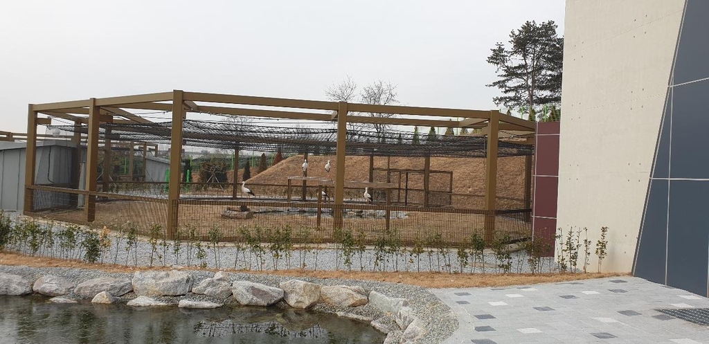 연구원은 황새 45마리를 사육하는 청람황새공원 내 사육시설 3곳, 배수시설, 먹이 저장시설, 태양광 발전시설을 새롭게 마련했다.