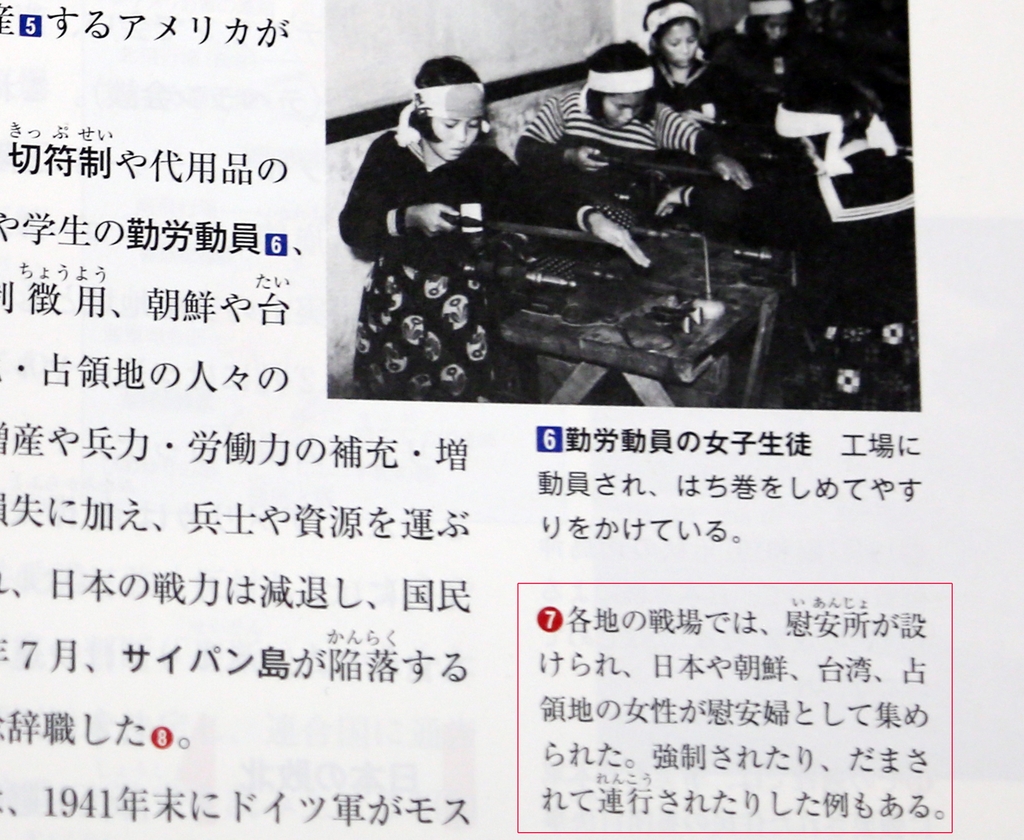 예를 들어 '역사총합 근대로부터 현대로'는 "각지의 전장(戰場)에는 위안소가 설치돼 일본이나 조선, 대만, 점령지의 여성이 위안부로 모집됐다. 강제되거나 속아서 연행된 예도 있다"고 일본군 위안부 문제에 관해 설명했다.