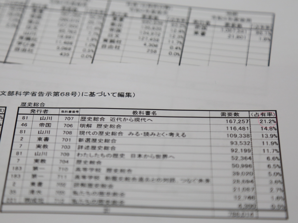 역시 야마카와의 '현대의 역사총합 보다·해독하다·생각하다'가 점유율 13.9%로 3위였고 같은 출판사의 '우리들의 역사, 일본으로부터 세계로'가 6.6%로 6위였다.