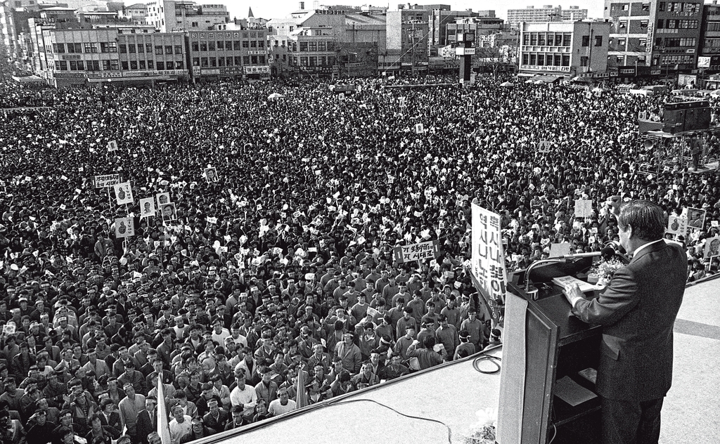 | ▲ 서울 금호초등학교에서 열린 제7대 대통령 선거 김대중 후보 유세에서 시민들이 연설을 듣고 있다. 1971년 [한치규 제공] |