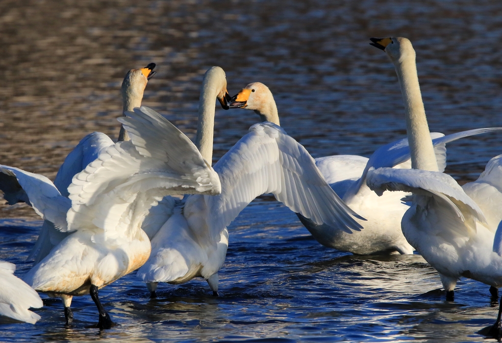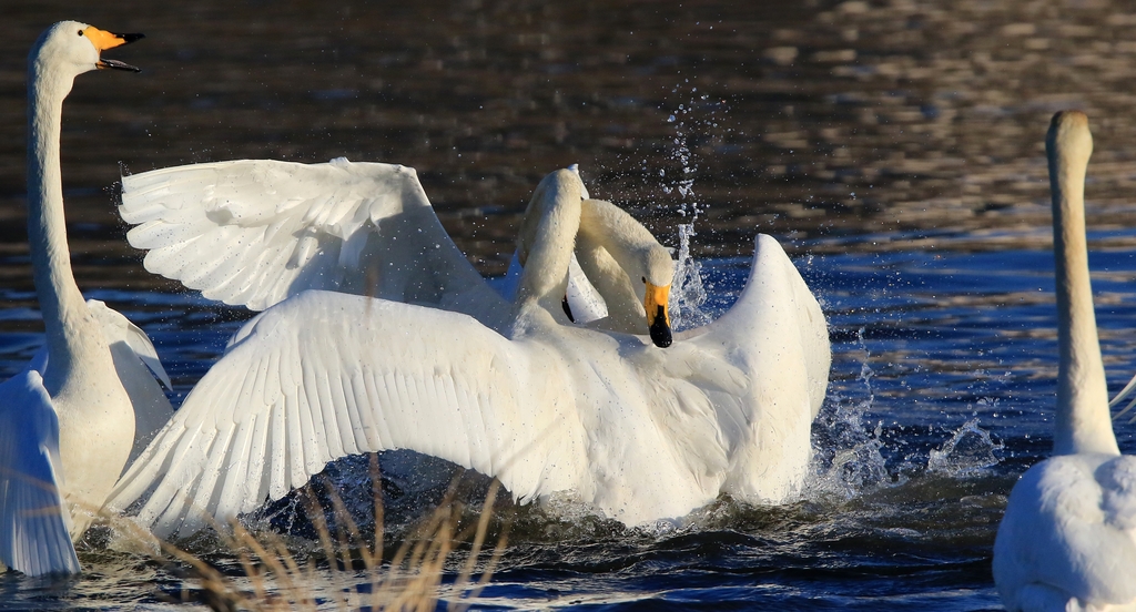 양 가족의 대장으로 보이는 큰고니가 날갯짓하고 목을 길게 뺀 채 소리를 꽥꽥 지르며 기선 제압에 나섰다.