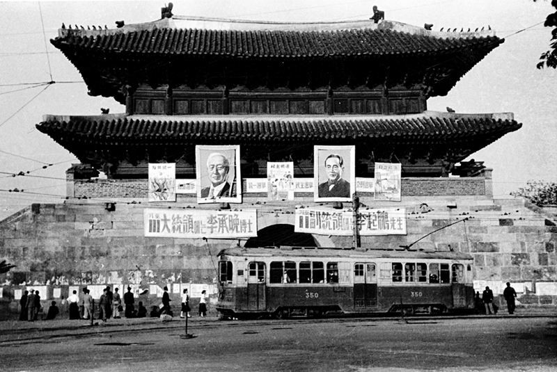 | ▲ 제3대 대통령 선거 홍보 포스터가 동대문에 걸려 있다. 1956년 [국가기록원 제공] |