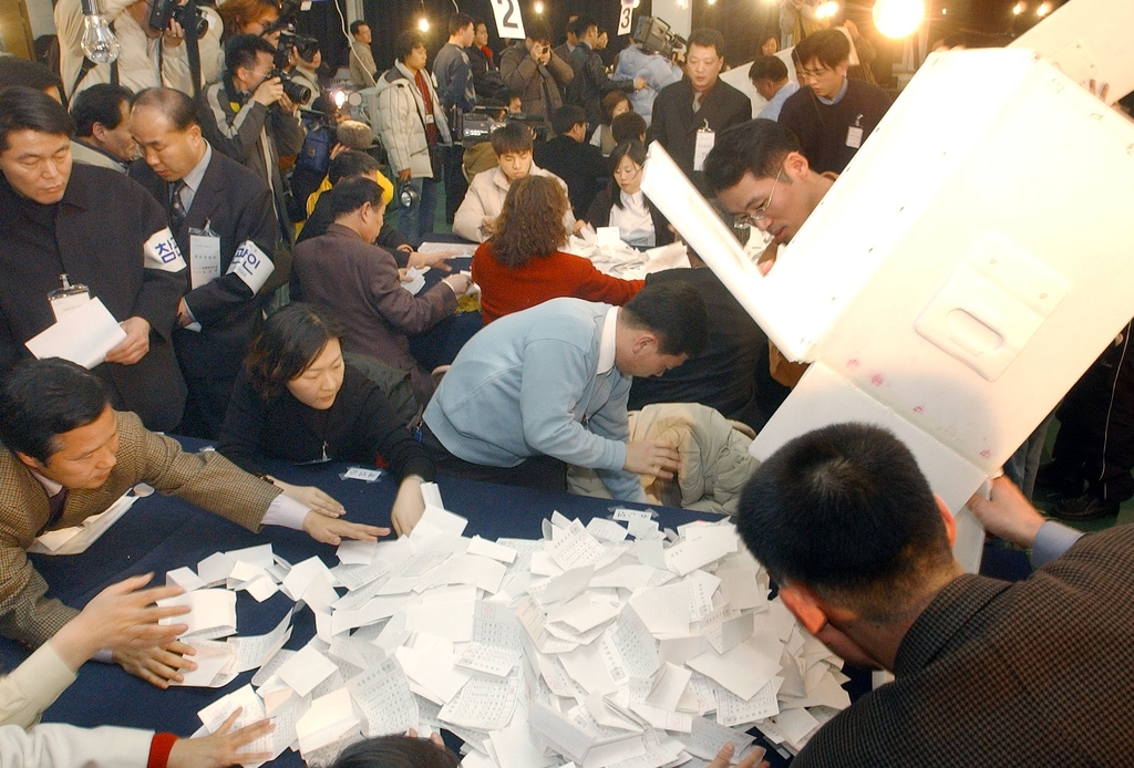 | ▲ 종로구청에 마련된 제16대 대통령선거 개표소에서 개표 종사원들이 투표함을 개봉하고 있다. 2002년 [연합뉴스 자료사진] |