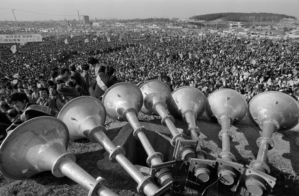 | ▲ 전북 이리(지금의 익산)에서 열린 김대중 평민당 후보의 유세장에 설치된 대형 나팔 스피커. 1987년 [연합뉴스 자료사진] |