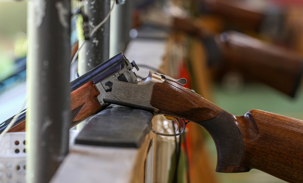 | ▲ 약실이 보이게 총신이 꺾인 채 거치된 클레이 사격용 산탄총. 안전줄로 묶여 있다. [사진/진성철 기자] |