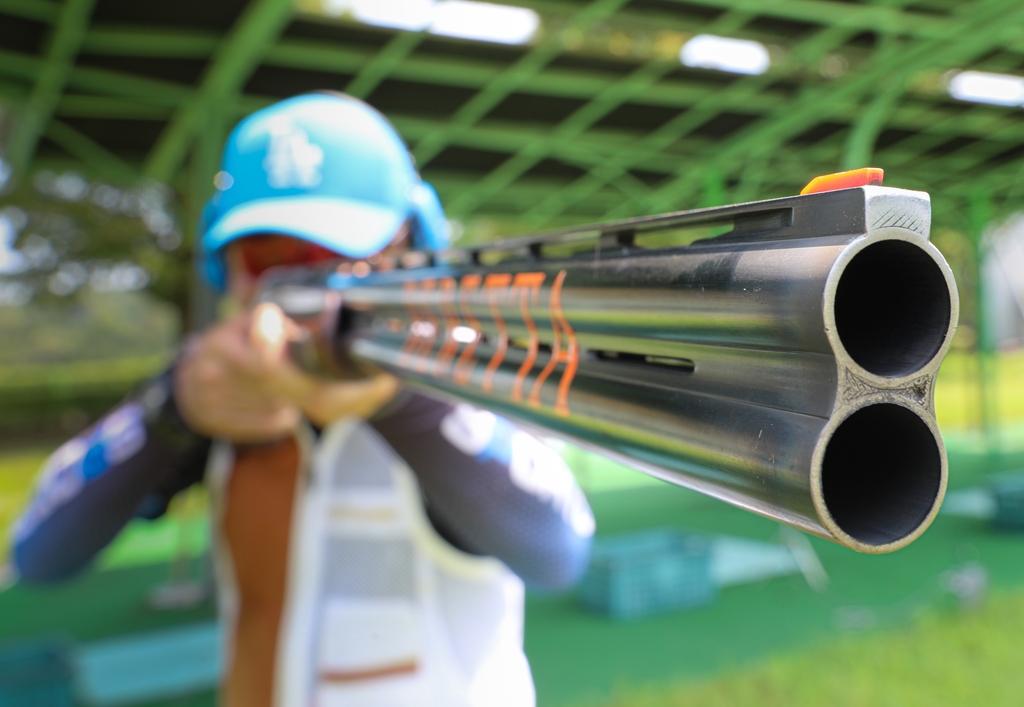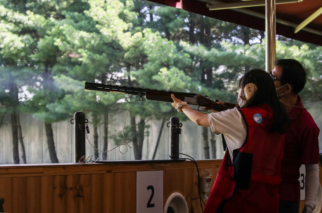| ▲ 경기도사격테마파크 클레이 사격 체험장에서 방문객이 산탄총으로 날아가는 클레이 접시를 조준하고 있다. [사진/진성철 기자] |